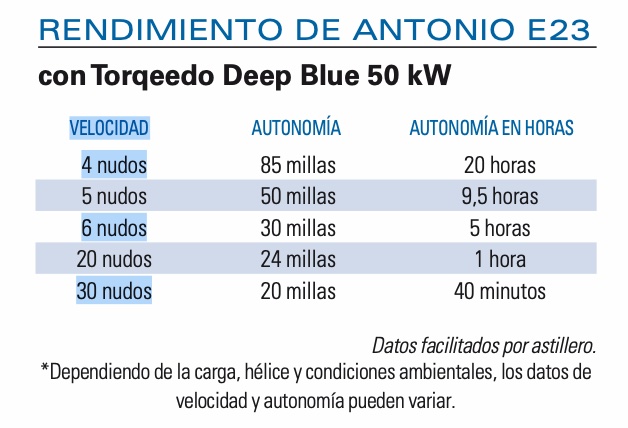El sistema de propulsión del E23 cuenta con un único fueraborda central Deep Blue 50, un propulsor sin emisiones que propulsa al E23 a velocidades de hasta 30 nudos. La batería Deep Blue de 40 kW/h del sistema proporciona energía suficiente para un día en el agua, con una autonomía según el fabricante de 6 horas a unos 6 nudos, 10 horas a 5 nudos o 22 horas a 4 nudos. La electrónica del E23 ha sido desarrollada conjuntamente por Simrad y Torqeedo de manera que el Deep Blue ofrece un manejo intuitivo, con toda la información crítica presentada en una pantalla multifunción que proporciona cálculos de autonomía, velocidad, estado de carga y tiempo de funcionamiento en tiempo real, una visión completa de todo el sistema, una visualización del flujo de energía y acceso a todas las funciones de control.