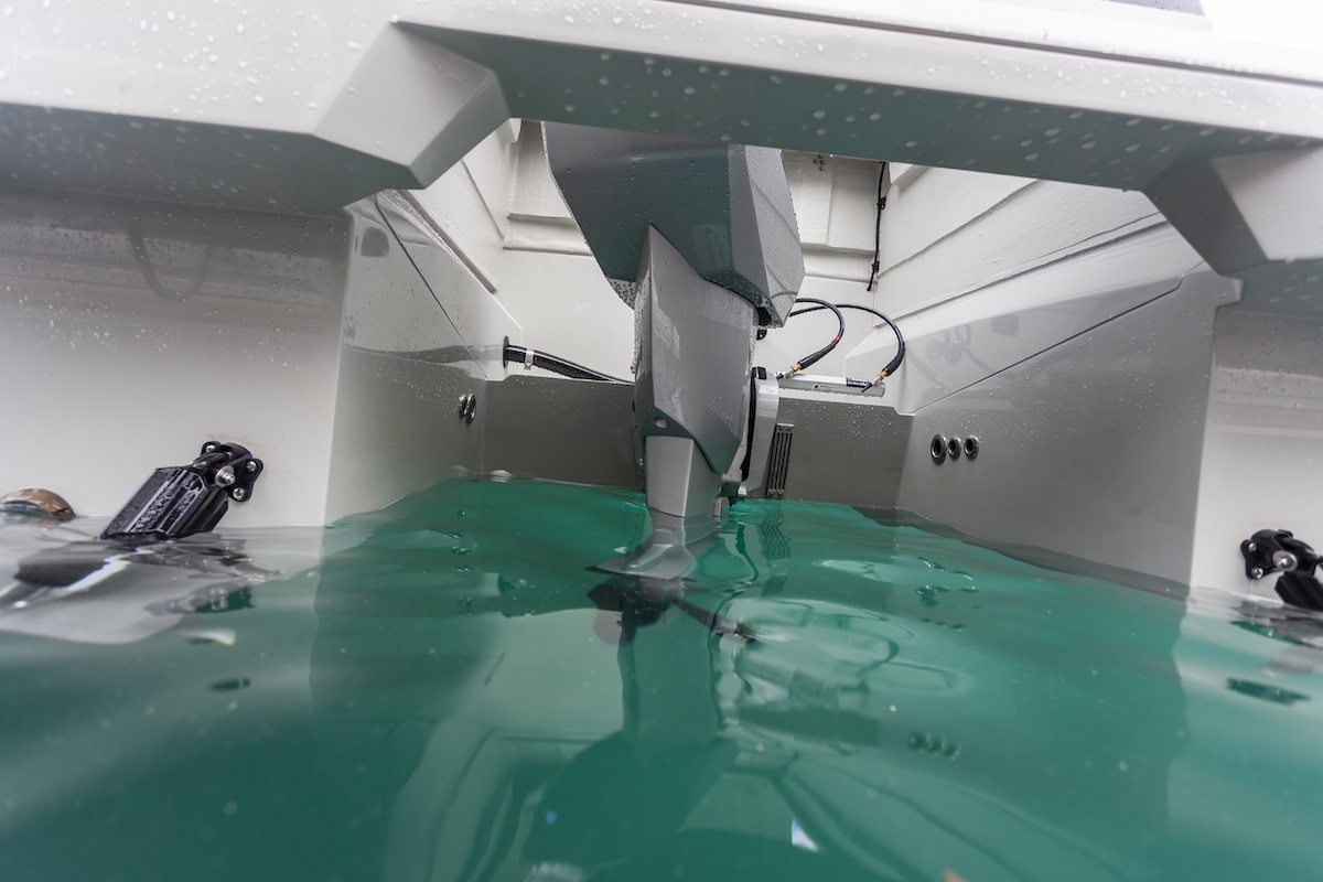 Con un transom central potente para evitar que el agua choque excesivamente con el motor, equipa en popa de los cascos dos flaps automáticos con un foil en T invertida adosado a los mismos que ayudan decisivamente tanto a la estabilidad del barco como a la sencillez de gobierno.