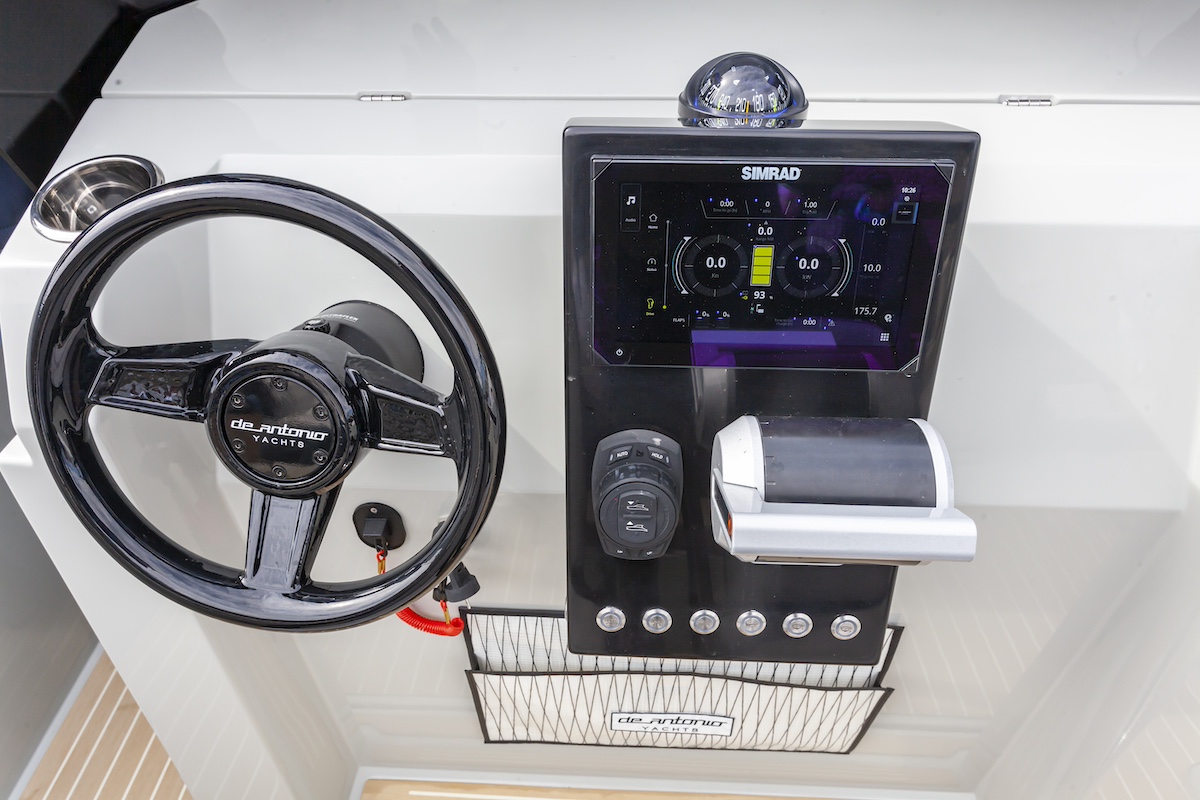 En popa, sobre la cámara que alberga el motor, el sello del astillero que caracteriza todos los modelos de De Antonio Yachts se mantiene: una amplia superficie acolchada central, a modo de solárium, flanqueada por los dos pasos de acceso a pie plano a bordo, permite disfrutar de momentos de relax en popa. La consola central cuenta con dos asientos individuales, para patrón y acompañante, y queda perfectamente protegida por un parabrisas envolvente. El módulo alberga en su interior un wc al que se accede por la parte frontal de la consola. En suma, el E23 es un modelo innovador tanto desde el punto de vista del diseño y configuración de la obra viva como de la propulsión. El resultado de este bien resuelto ejercicio de arquitectura y diseño es una embarcación eficiente en términos de velocidad y consumo eléctrico, y que responde perfectamente a los parámetros de sostenibilidad, que se están imponiendo en el sector.
