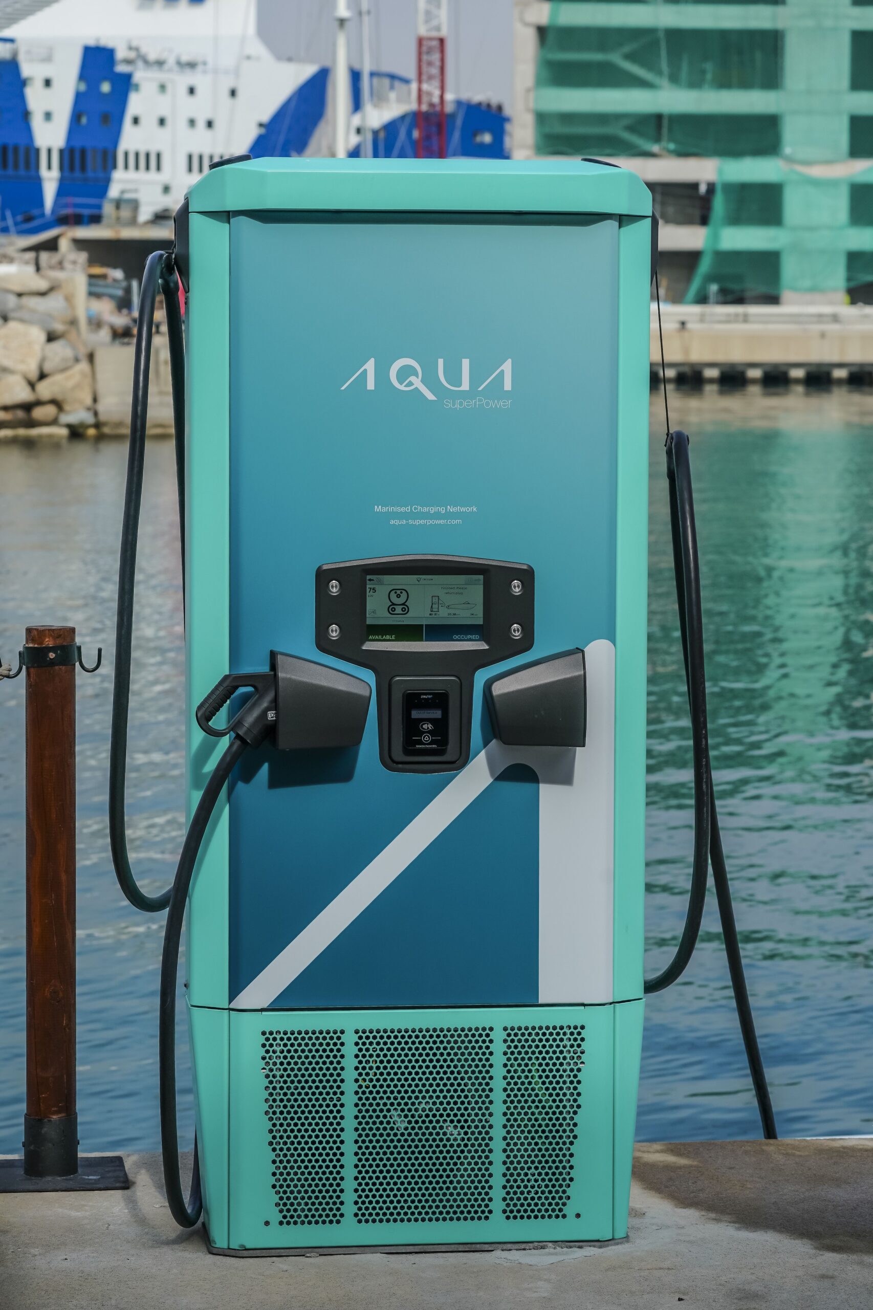 El cargador ha sido instalado y financiado por la empresa británica Aqua superPower. El dispositivo tiene una potencia de 75 kW y dos conectores CCS2, para poder cargar hasta dos embarcaciones de forma simultánea, en tan solo 20-40 minutos. El cargador funciona con una aplicación que se puede descargar en cualquier dispositivo.