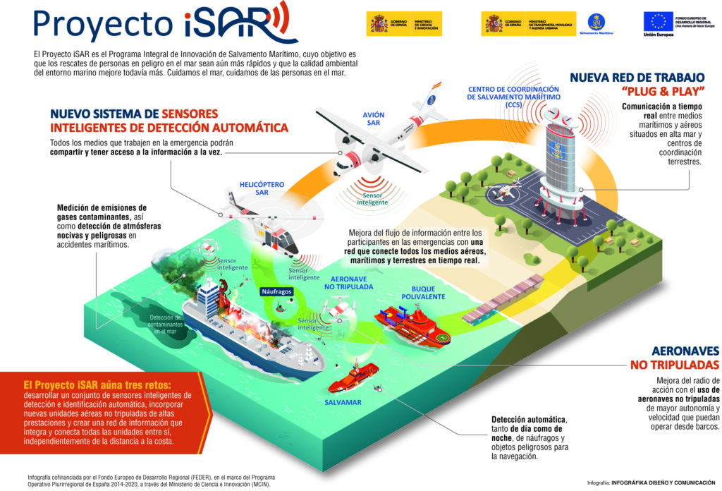 iSAR es más Salvamento Marítimo. Es un proyecto que permite ayudar no solo a las personas, sino también al planeta dentro del contexto de cambio climático. Este proyecto optimiza la detección y el rescate de náufragos, la localización y la recuperación de objetos a la deriva que puedan suponer un riesgo para la navegación. Pero también facilita la identificación de los vertidos de hidrocarburos y otras sustancias contaminantes sobre la superficie del mar y activa la detección de atmósferas nocivas y peligrosas.