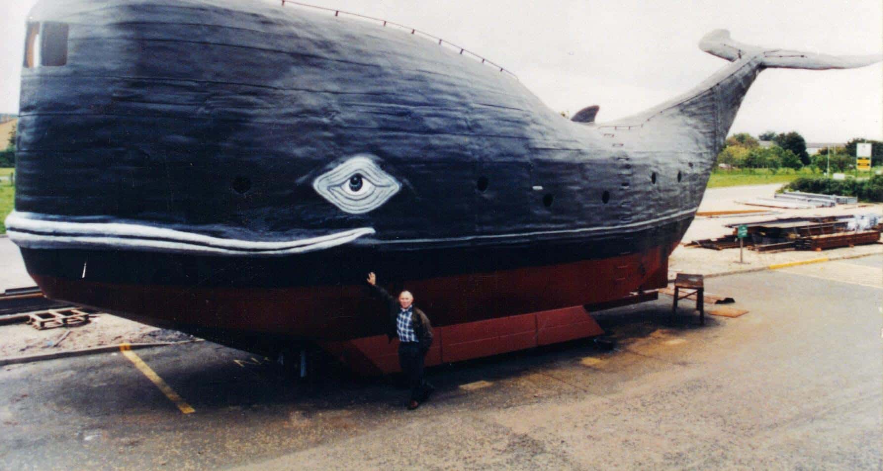 Moby, el único barco con forma de ballena más grande del mundo, mide 65 pies de eslora (19, 91 metros), 25 pies de altura (7,62 metros) y un peso de 60 toneladas, equipado con 2 motores y cubierto de espuma que imita la piel de una ballena. Moby fue diseñado por Tom McClean, las pruebas de mar tuvieron lugar entre delfines en el fiordo de Moray en Escocia. Tom ha completado una singladura de 2.000 millas alrededor de Gran Bretaña en el interior del vientre de la ballena “Moby”.