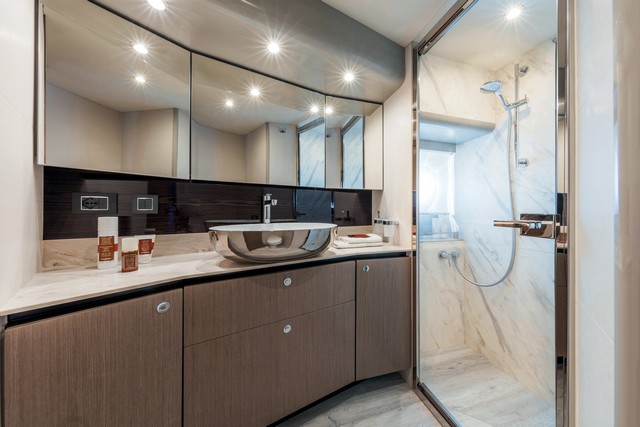 La de proa, destinada al armador, espectacular por sus dimensiones y por la luz natural, es sin duda un punto fuerte de este barco, cuya cama de matrimonio encara el cabezal a la amura de estribor. Dispone de su aseo completo propio, con ducha independiente. La planta de esta zona privada se completa con otras dos cabinas, una VIP a babor, con una cama de matrimonio, y otra con dos literas individuales.