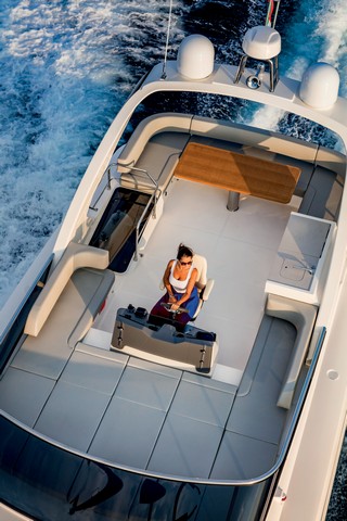 Delante, la cubierta brinda un amplio solárium cubriendo la cabina delantera. Las grandes colchonetas disponen de reposacabezas elevables y los recortes laterales con un escalón de teca refuerzan la estética de la proa, por otra parte, bien equipada para la maniobra de amarre y fondeo.