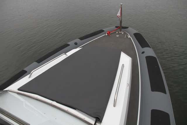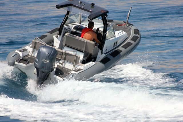 El F300 está muy bien adaptado a esta eslora, y aunque el astillero propone motorización con dentrofueraborda con un Volvo Penta de 220 Hp (alcanza los 40-42 nudos de punta), nos quedamos con el V6. La pareja ideal para esta semirrígida.