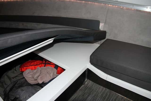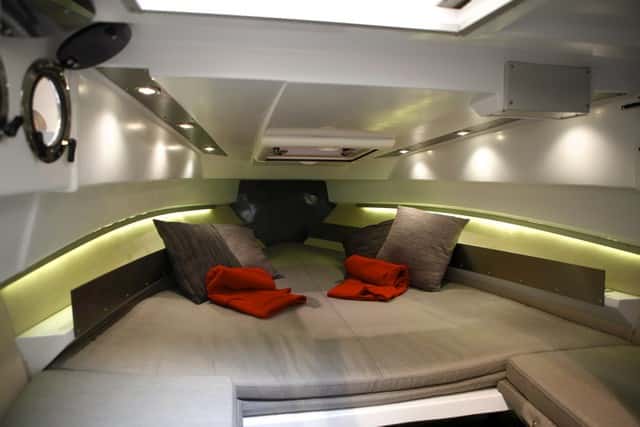 Es un punto fuerte de este modelo. Agapi ha demostrado que sabe aprovechar el volumen en esta eslora obteniendo una cabina más que satisfactoria. Es capaz de acomodar hasta cuatro personas para pernoctar con comodidad. La litera de proa, tradicional para dos personas, se complementa con la situada junto a la entrada (destinada a los más pequeños) que se monta desplegando una colchoneta, que va recogida en el mismo espacio (una solución que se agradece).