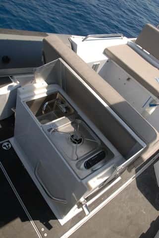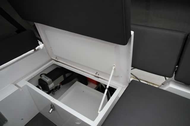 La nevera va escamoteada bajo el módulo del asiento del módulo del piloto y la cocina, con un lavamanos y un fogón, aparece cuando se levanta la base de este mismo asiento.