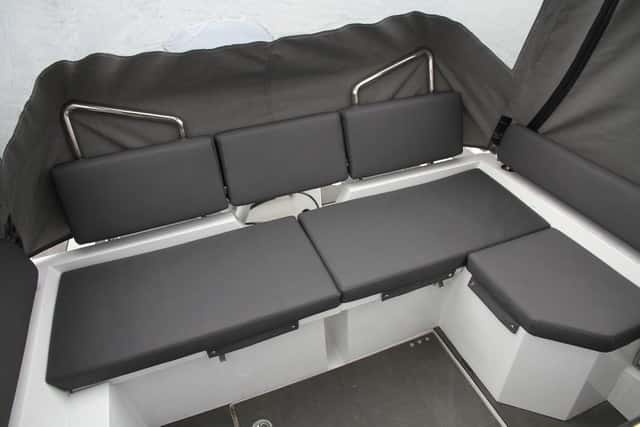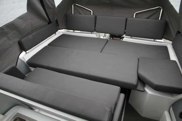 La bañera es convertible, ya que puede acomodar hasta siete personas con amplitud en torno a la mesa o convertirse en un segundo solárium de popa al desplazar el asiento de popa hacia atrás.