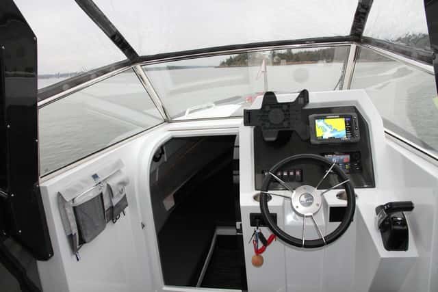 Un barco que alcanza supera los 50 nudos de punta ha de tener un puesto de gobierno cómodo, seguro y con excelente ergonomía. Y así es. El piloto dispone de una buena consola y un parabrisas más alto de los que es habitual en una embarcación mediterránea (será por lo del frío del Norte).
