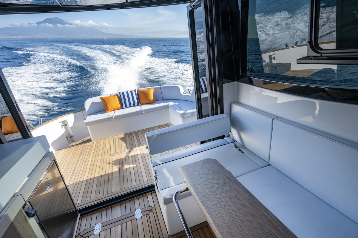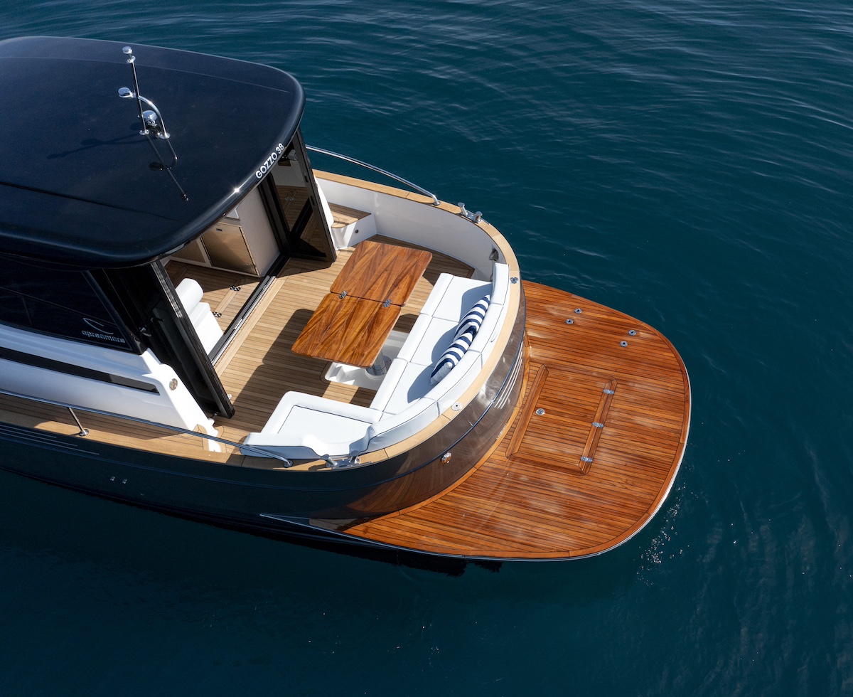 Gracias a la separación entre motores y la hélice de proa la maniobrabilidad es perfecta, por lo tanto, la puede controlar una sola persona. Sus 11,45 m de eslora por 3,70 m de manga son propulsados, en el caso de la embarcación que hemos probado en la bahía de Nápoles, por dos motores intraborda Volvo Penta D4 de 320 Hp, si bien cabe la opción de un motor más pequeño, el D4 270 Hp. El rango de velocidad crucero es amplio, entre los 15 y los 19 nudos. En relación al consumo, 19 es una muy buena velocidad para un barco de esta eslora. La aceleración es veloz e inmediatamente baja la proa: tan solo 4 segundos fueron suficientes para que adoptara condición de planeo. El Apreamare Gozzo 38 Cabin es una evolución del exitoso modelo Gozzo 35, el best seller del astillero y es una opción que permitirá alargar la temporada de navegación o en condiciones en las que no resulta tan apetecible navegar en el exterior. No hay ninguna duda que los mercados del norte ya no tienen excusa para navegar un barco mediterráneo y los mediterráneos ya no tienen excusa para no navegar en invierno.