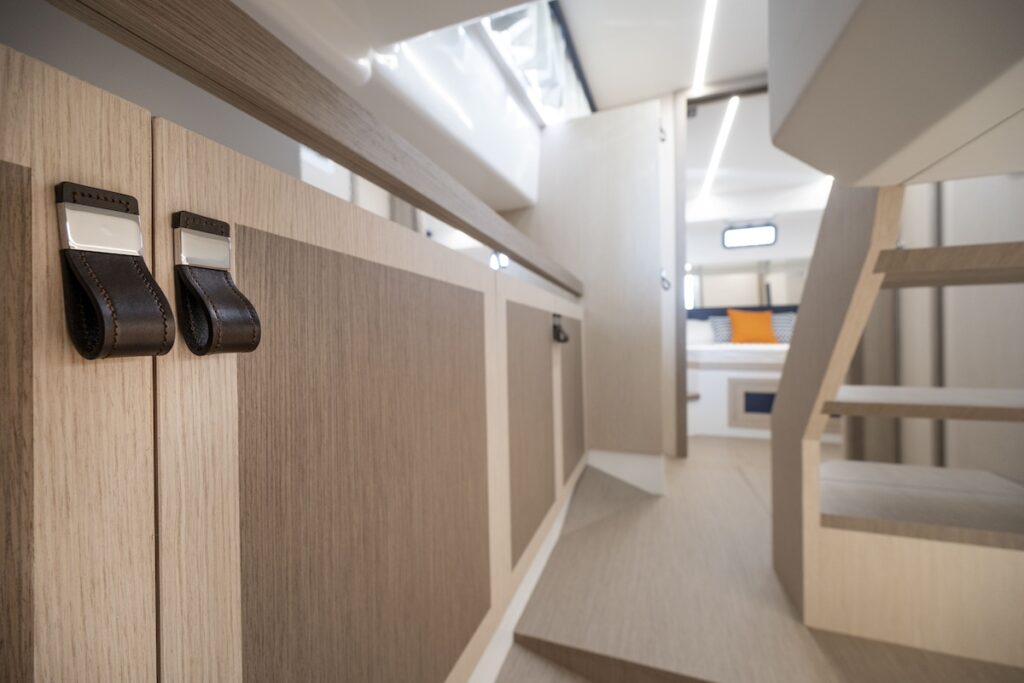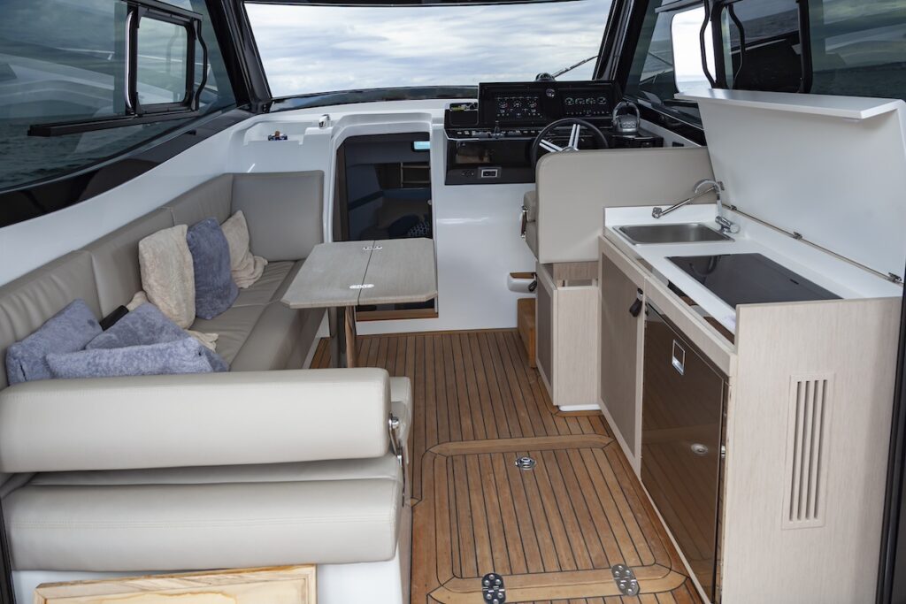 A las personas del Mediterráneo nos cuesta entender la vida sin sol, pero los nórdicos saben su verdadero valor, por lo que en cuanto tienen una oportunidad, no la desperdician. Seguramente estarán agradecidos del generoso solárium de proa y del banco que es un lugar prometedor, por ejemplo, para la puesta de sol o durante una navegación tranquila. También se debe apreciar el espacio de la bañera con un generoso sofá y una mesa que forma parte del plan de la bañera y que se eleva mediante un pistón eléctrico, para desplegar una plataforma abatible en la que la madera habla del trato que recibe de sus artesanos. Transitar de proa a popa, y viceversa, resulta fácil y seguro, gracias a la altura del guardamancebos. La bañera misma es un sitio seguro y protegido en navegación y al llegar a la cala preferida una puerta en estribor permite el paso hacia una generosa plataforma de baño, sello de identidad de la marca. Es un sitio para disfrutar de forma relajada o con niños, un espacio muy amplio que incluye hasta un cofre de estiba.