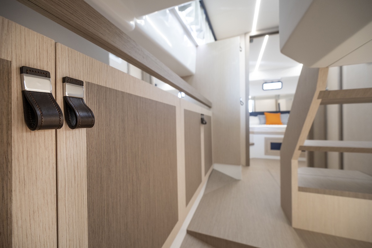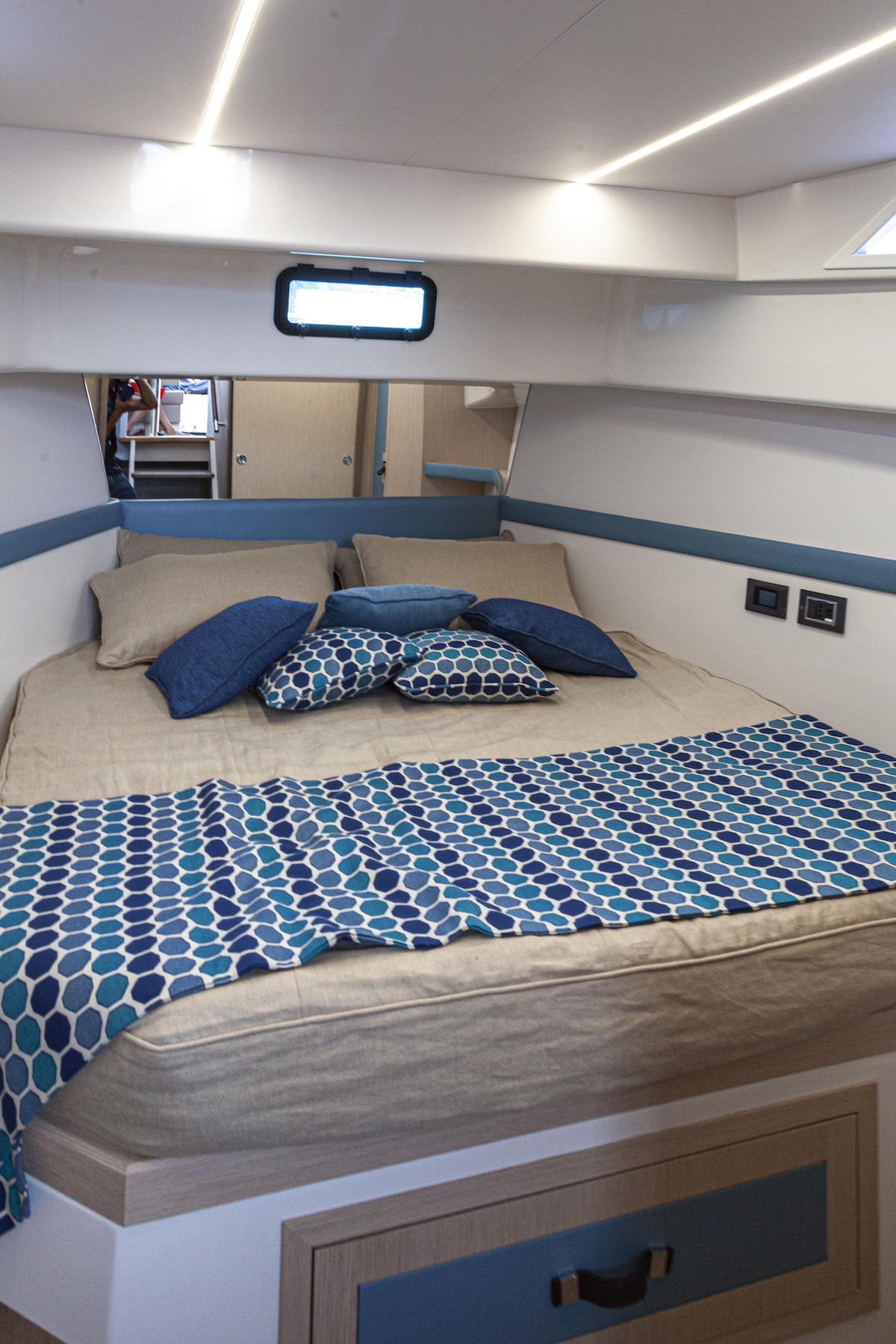 Al bajar al interior notamos la calidad de los acabados y del trabajo realizado en la madera. El triángulo de proa corresponde a una cama doble, elevada para dejar espacio de estiba en la parte inferior. En general, el espacio de estiba es abundante. Hacia popa se ha dispuesto otra cama doble, aunque con la altura interior limitada.