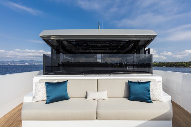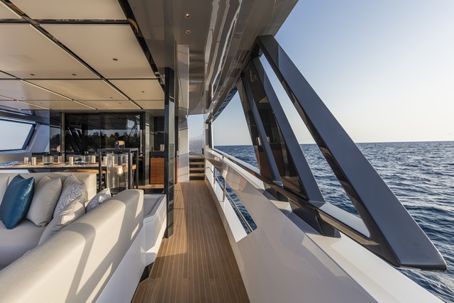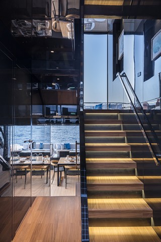 La superestructura alrededor de la cabina está circundada por grandes ventanas  a toda la altura que permiten a los invitados disfrutar plenamente de la vista mientras se relajan en los sofás o se sientan en la mesa que es lo suficientemente grande como para acomodar de ocho a diez personas. Sin embargo, el rasgo más distintivo y que más acentúa el concepto de unión entre interior y exterior  y la prioridad y la relación con el mar y el entorno, es definitivamente el entrepuente o skylounge  de 35 metros cuadrados, donde, gracias a las ventanas que se deslizan verticalmente simplemente con presionar un interruptor, no solo se reduce la necesidad de aire acondicionado, ya que permite esto permite que la brisa marina entre sin obstáculos, sino que además ofrece la sensación de estar totalmente integrados en el entorno.