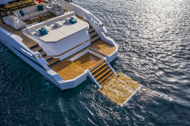 Dos escaleras simétricas dan acceso a la plataforma de popa, con una pasarela integrada que desciende bajo el nivel del agua.