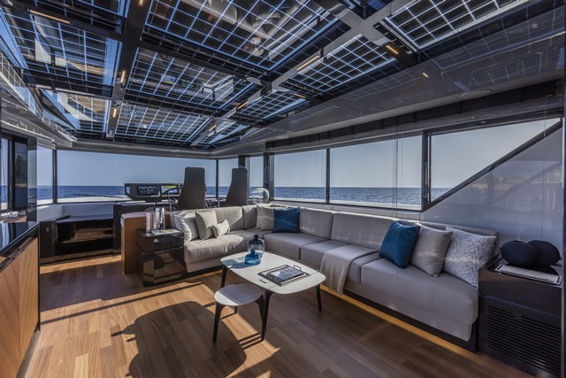 De aquí la profusión de paneles solares —con una capacidad de hasta 3 kW— que permiten reducir el uso del generador cuando se está fondeado o en el amarre, las grandes ventanas con paneles de vidrio de alta tecnología y gran capacidad de aislamiento térmico que recorren todo el perímetro de la superestructura o el casco de semiplaneo de alta eficiencia