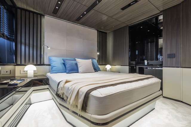 La cabina principal tiene más de 22 metros cuadrados. No está compartimentada, y ocupa toda la manga por lo que los propietarios pueden disfrutar de un espacio grande, abierto y lleno de luz gracias a las ventanas panorámicas en el casco.