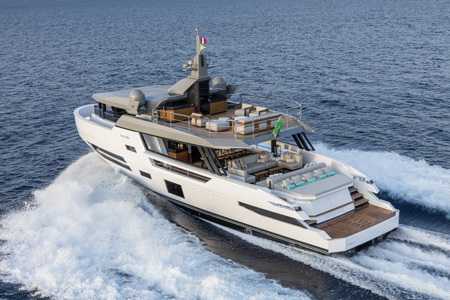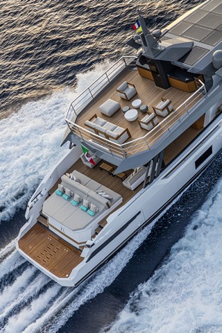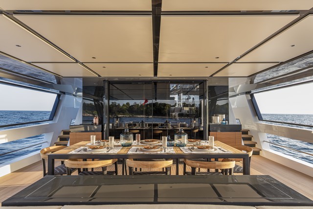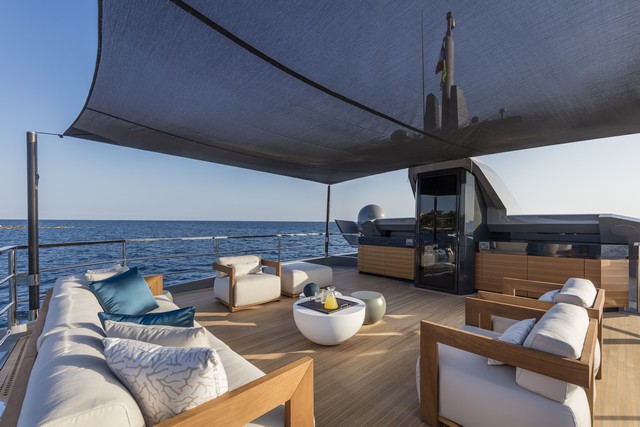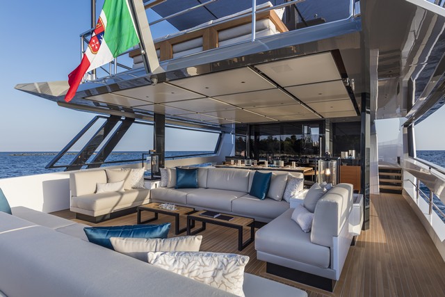 La búsqueda de la relación directa con el mar se ve claramente en la disposición del salón interior de la cubierta principal, que está conectado a la plataforma de popa a través de un espacio a modo de terraza. Esta zona, de casi 65 metros cuadrados, está libre de obstáculos y constituye un área privilegiada de relax al aire libre con sofás, mesa comedor y un gran solárium sobre la plataforma que cubre la sala de máquinas y el garaje.