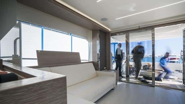 La zona principal, al mismo nivel de la bañera puede quedar totalmente abierta en comunicación con el exterior. Distribuye un sofá con la televisión en el lado opuesto, gran salón, la cocina totalmente equipada un formidable puesto de gobierno con una gran consola de doble pantalla multifunción y dos asientos elevados que permite una perfecta visión de casi 360 grados gracias a las grandes cristaleras de esta zona. La zona privada reparte tres cabinas con sus tres respectivos aseos completos. Destaca la del armador, a media eslora, con una superficie de nada menos que 18 metros cuadrados, ocupando toda la manga y con un baño ocupando la parte posterior de la cabecera de la cama, con ducha independiente de grandes dimensiones. Llaman la atención las grandes cristaleras que, en realidad forman parte del casco del barco, y que permiten una gran luminosidad natural y una visión al exterior prácticamente al nivel del mar.