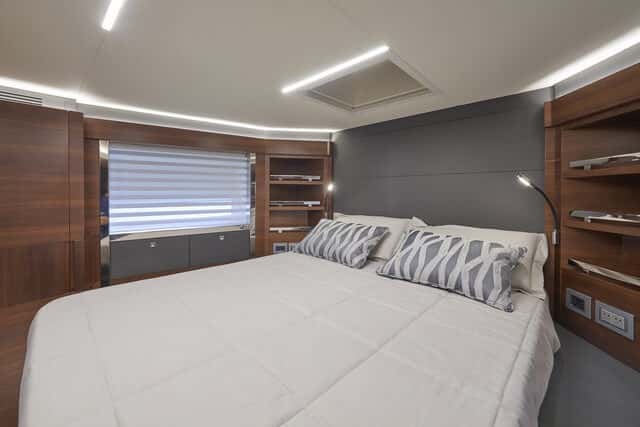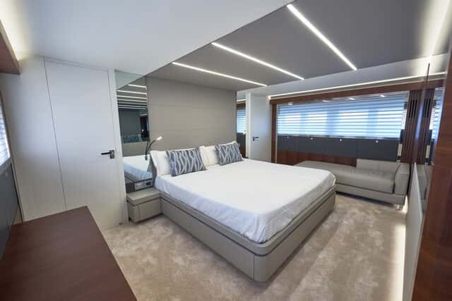 Con capacidad hasta para 16 personas embarcadas y ocho plazas de pernocta, el Astondoa 80 Flybridge dispone de cuatro camarotes con sus baños, para armador e invitados. La cabina del armador ocupa la zona central del barco, a toda la manga, lo que le permite dispones de un gran baño y vestidor ropero que la aísla de la sala de máquinas, además de una mesa-tocador, habilitable como despacho, ocupando toda la longitud de la cabina a estribor, y un pequeño salón de estar a babor.
