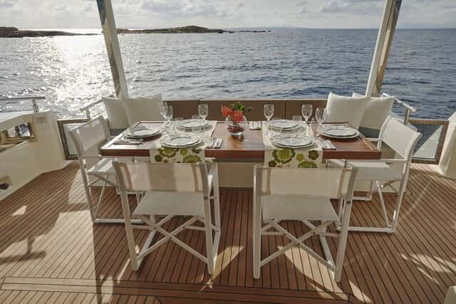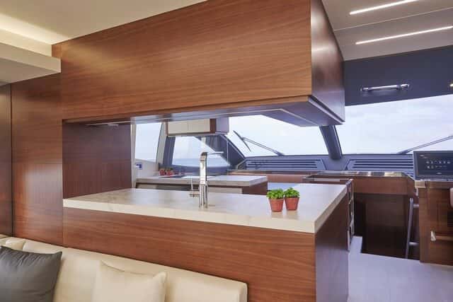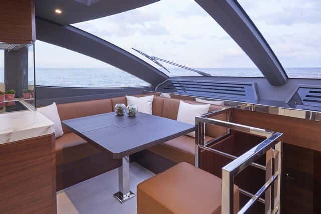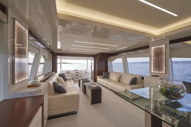 Circundado por grandes ventanales que proporcionan luz y vistas hacia el exterior, en el interior prima la estética contemporánea y detalles que resaltan la elegancia del barco, con un amplio salón comedor a un mismo nivel con la zona de cocina y el puesto de gobierno. La cubierta de popa se abre al salón a través de unas puertas de acero inoxidable triples haciendo de él una extensión de la cubierta. Los ligeros mamparos de roble exclusivos combinan a la perfección con una paleta de color que se extiende desde blanco a gris topo, con sofás de cuero en el salón y acentos de acero inoxidable pulido.