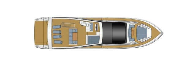 En su diseño, destacan sus singulares líneas resaltadas por la estructura del flybridge, dotado de techo solar abrible, que con sus soportes lanzados hacia proa le confieren un aire deportivo y moderno. A su vez, las grandes cristaleras que circundan la superestructura, así como sus ventanales laterales por encima de la línea de flotación, permiten disfrutar al máximo de las vistas al mar y de la extraordinaria luminosidad que reciben las estancias interiores del barco.
