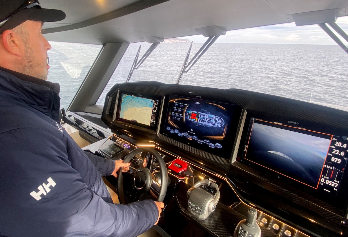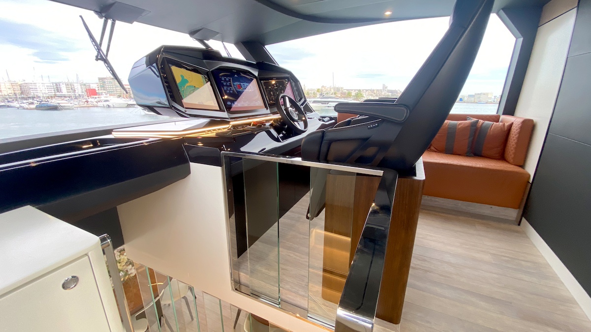 A través de una elegantes escaleras acristaladas, situadas en la parte media del salón-comedor, se accede al puesto de gobierno superior. Totalmente acristalado, pero con apertura superior, dispone de dos confortables asientos y un sofá en el lado de estribor. El panel está dotado de tres pantallas personalizadas, desde las que se puede controlar la embarcación y centralizar toda la domótica de servicios de a bordo.