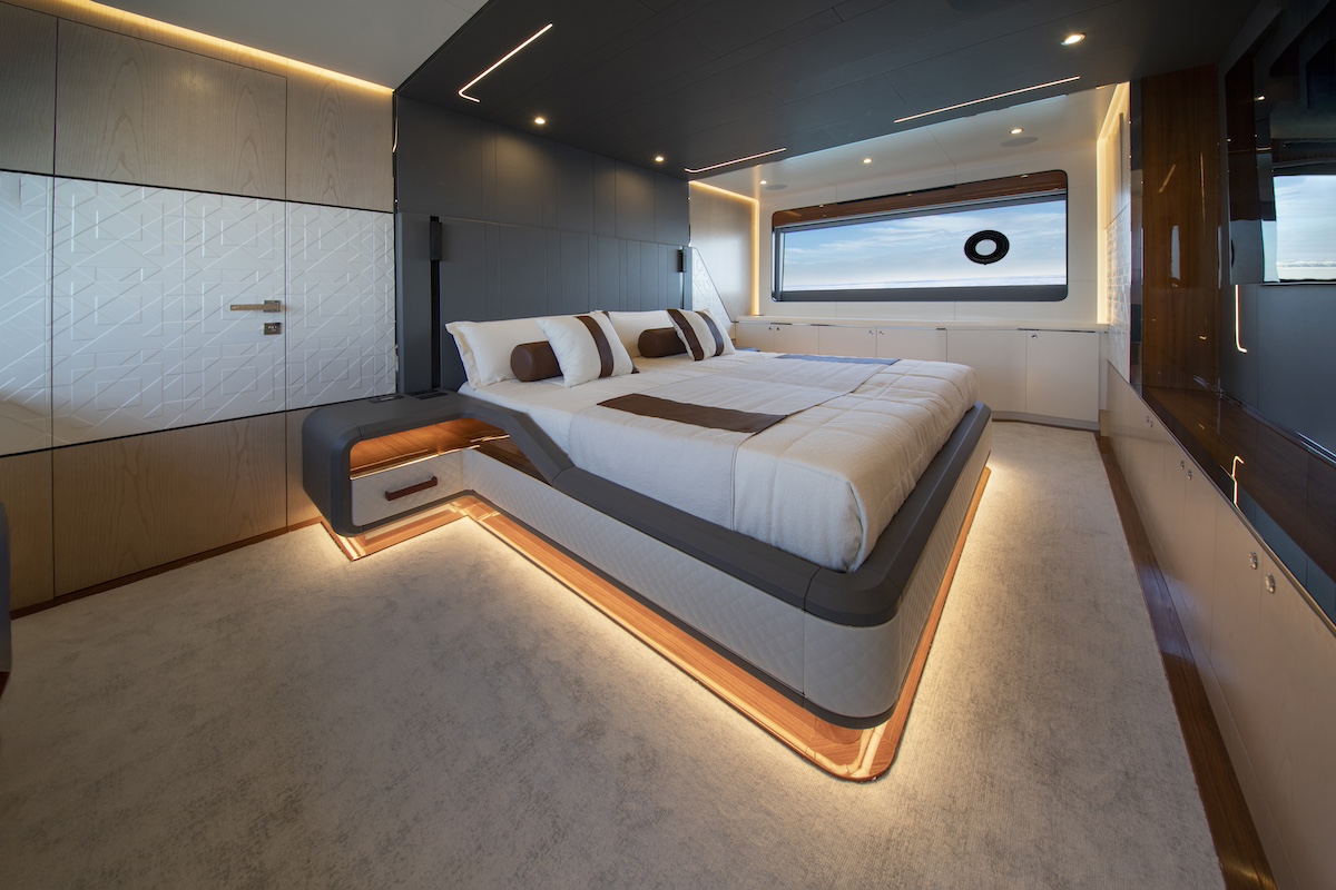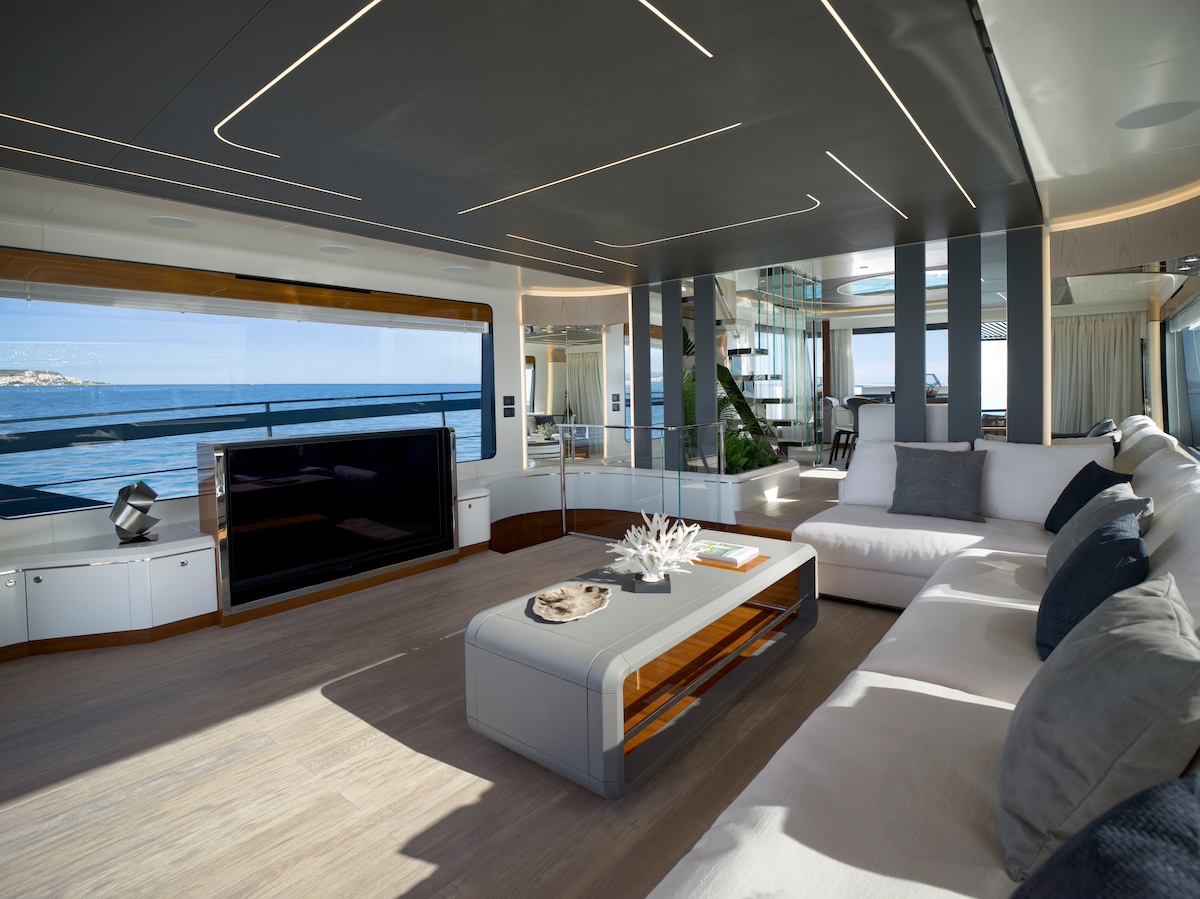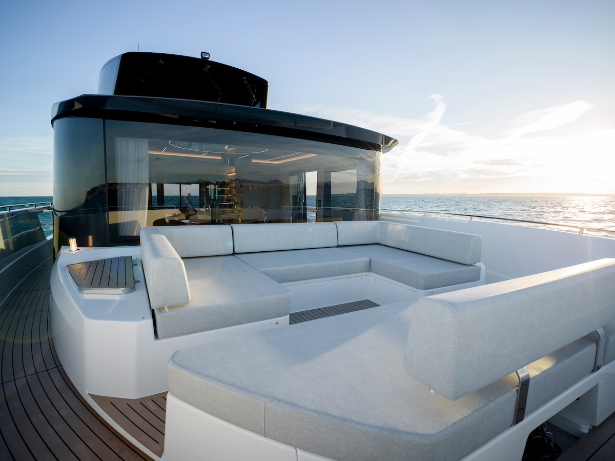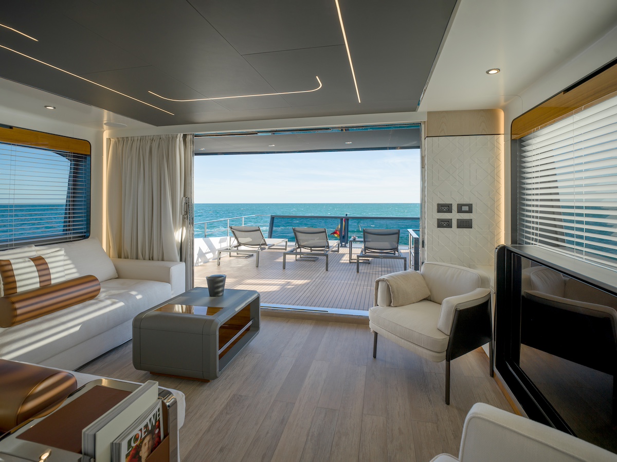 La exclusiva zona interior, que se puede decorar según la elección del armador, conecta mucho con la zona exterior en popa, creando una atmósfera cálida y elegante a la vez que funcional en su diseño.