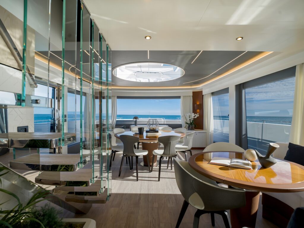 Manteniendo la concepción de modelos anteriores del astillero, el salón comedor abierto cuenta con grandes ventanales frontales y laterales que ofrecen unas vistas excelentes y buena luminosidad a este espacio vanguardista de diseño contemporáneo de alta gama.