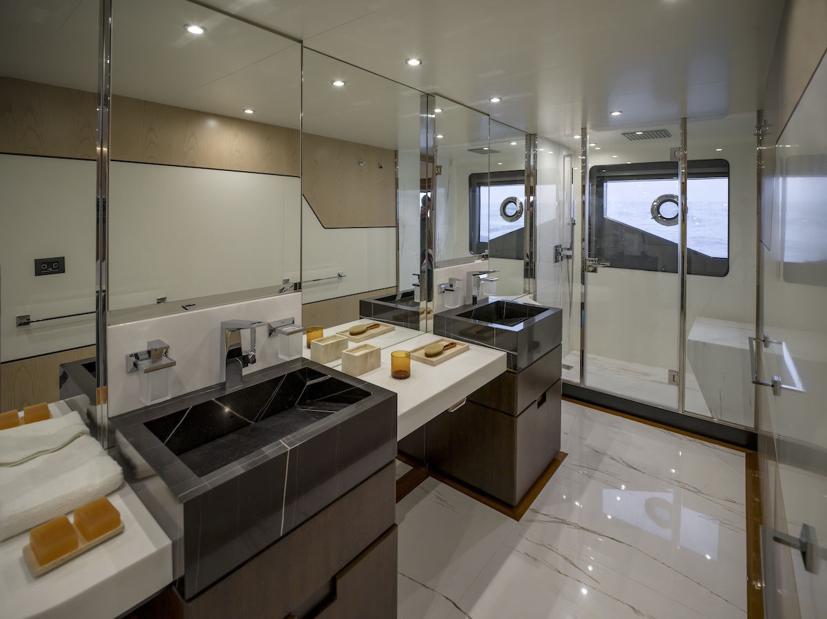 Situado a popa del camarote del armador, destacan las dimensiones del baño que, al igual que la cabina, ocupa toda la manga.