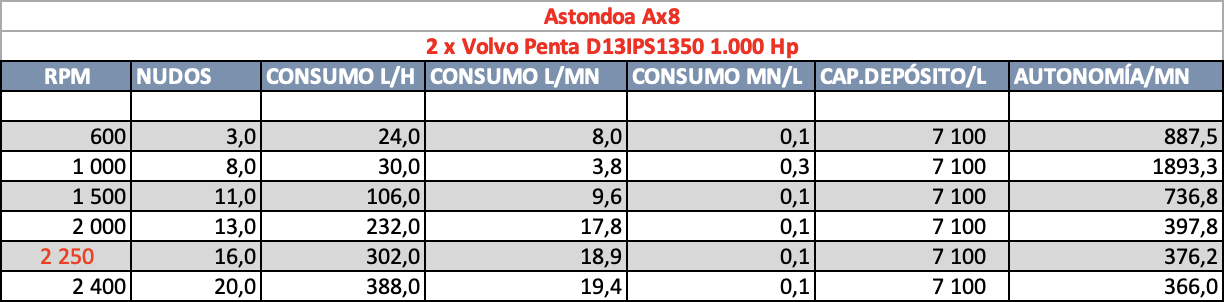 Dispone de una capacidad de combustible de hasta 7.100 litros y con sus dos motores Volvo Penta D13 IPS1350 de 1.000 Hp (735 kW) cada uno, a un régimen de crucero de unos 16 nudos se logran autonomías de 380 millas aproximadamente y casi 1.000 millas a una velocidad de unos 10 nudos.