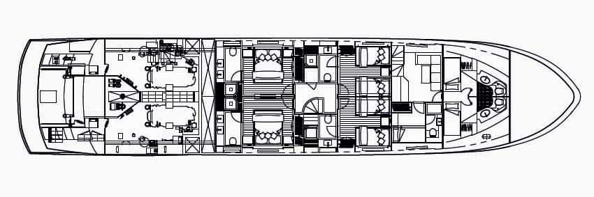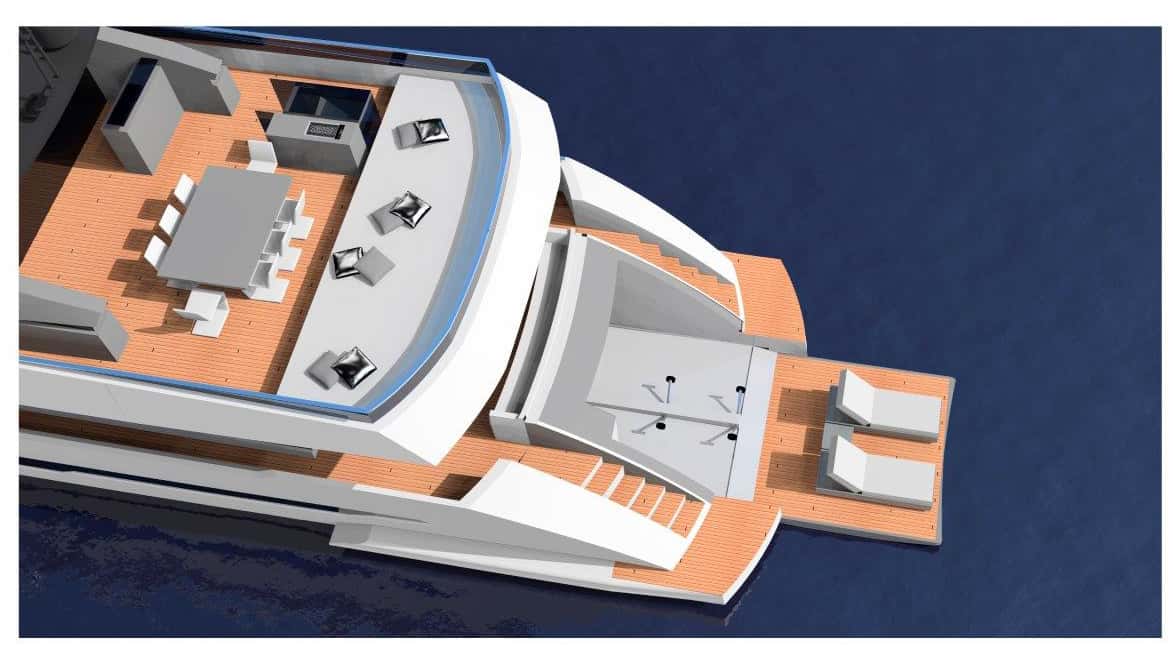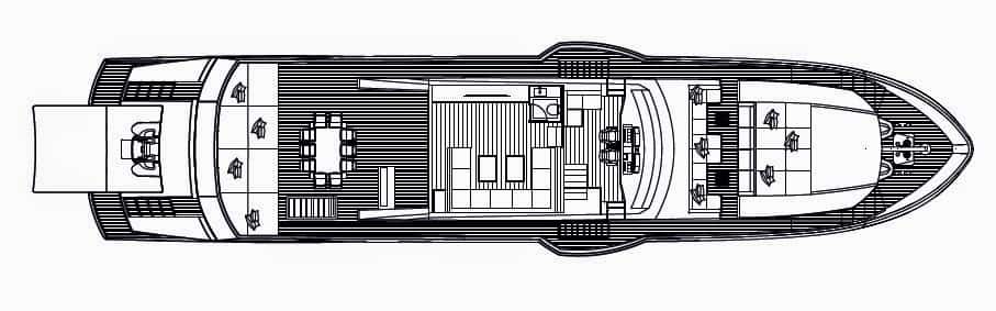 Esta unidad cuenta con una eslora de 33,5 metros y una manga de 7,03 metros, dando cabida de modo amplio y confortable a cuatro camarotes completos con sus respectivos baños, mas tres cabinas de marinería para capitán y cuatro marineros, con un magnífico flybridge, elemento singular que permite que se pueda disfrutar a la vez como salón cubierto o terraza al aire libre, combinado de forma sorprendente con la parte frontal que es la patronera, sin duda una de las singularidades de esta unidad.