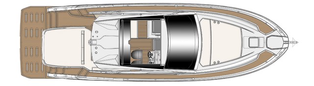 En el plano superior, la bañera, de distribución clásica aprovecha el espacio con un enorme solárium a popa, complementado por el de la cubierta de proa, una formidable dinete en forma de U a babor y un puesto de gobierno deportivo con dos asientos monoplaza complementado por un banco para acompañantes en el lado opuesto. La plataforma, a la moda, es grande, y no falta el hard top descapotable. La elegancia y los detalles quedan patentes en todos y cada uno de los rincones del barco.
