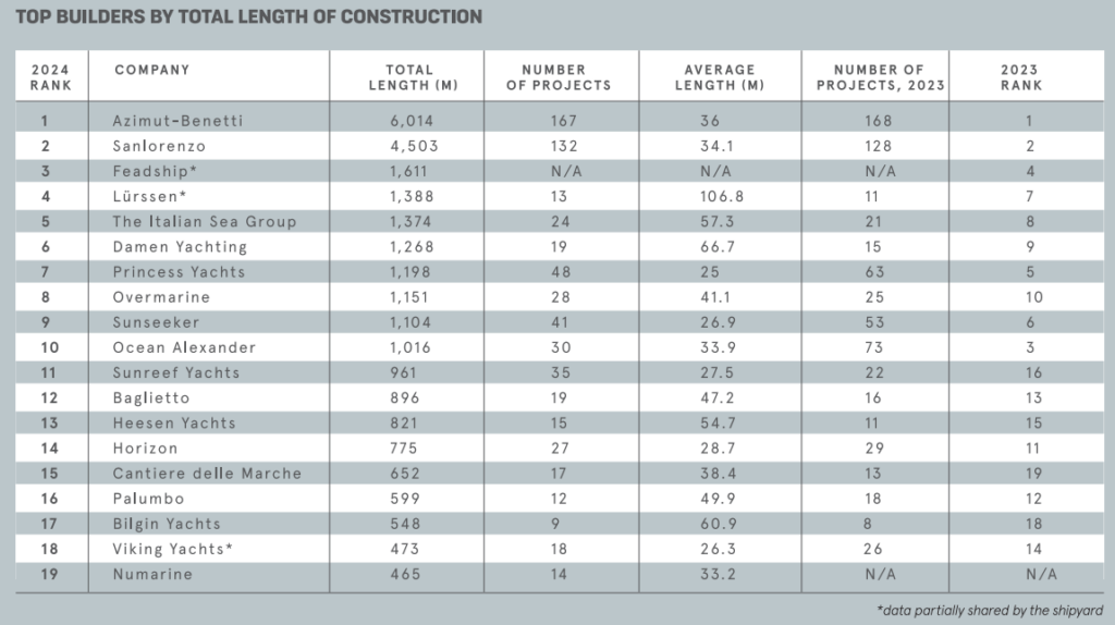 El Grupo Azimut|Benetti mantiene su posición como primer fabricante mundial de yates de más de 24 metros, afianzando su primer puesto en el Libro Global de Pedidos editado por la revista Boat International. Este libro recoge y analiza anualmente los datos de 177 astilleros de todo el mundo. La edición de 2024 otorga al grupo el primer puesto tanto por el número de unidades en construcción como por la longitud acumulada de los proyectos: 167 yates que suman 6.014 metros, lo que representa el 14% del mercado mundial.