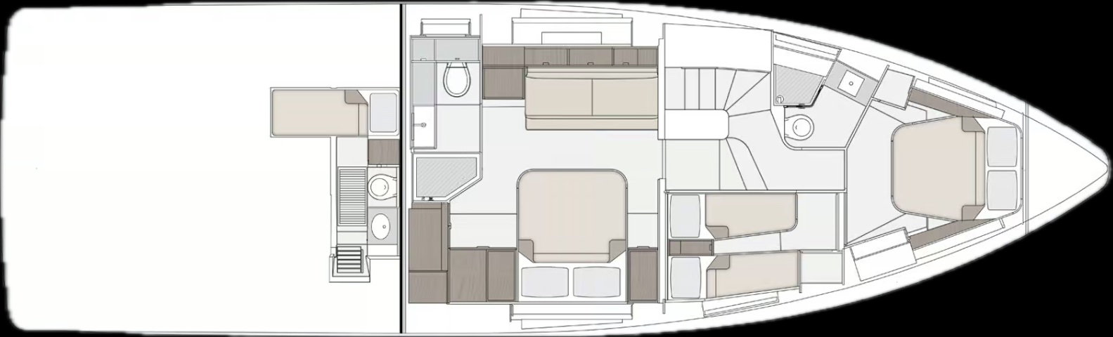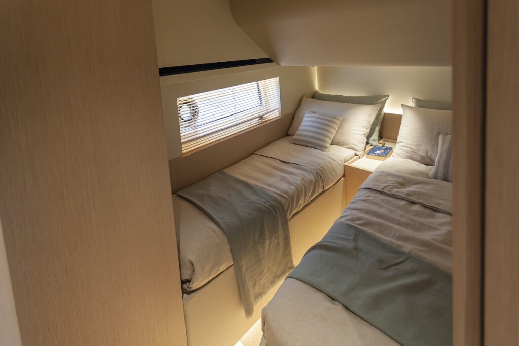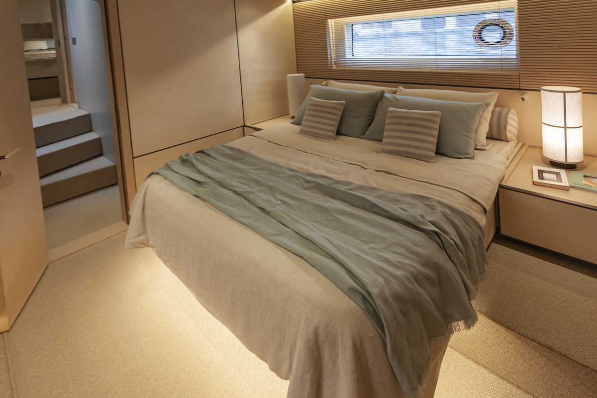La cabina principal ocupa de banda a banda. Se sitúa aproximadamente en el centro de la eslora y evidentemente mantiene el estilo minimalista del resto de las estancias, al igual que los materiales reciclados y/o reciclables utilizados en todo el barco. La cabina de proa es para invitados y hay una tercera cabina con dos camas. Los portillos del casco son la principal fuente de luz natural de cada cabina que se funde en los cálidos tonos claros de tapizados y maderas.