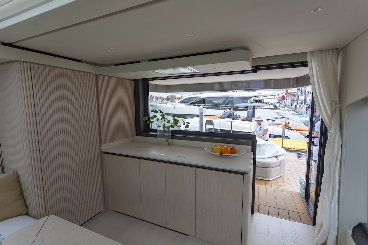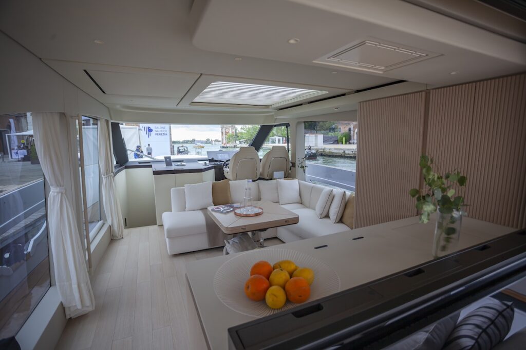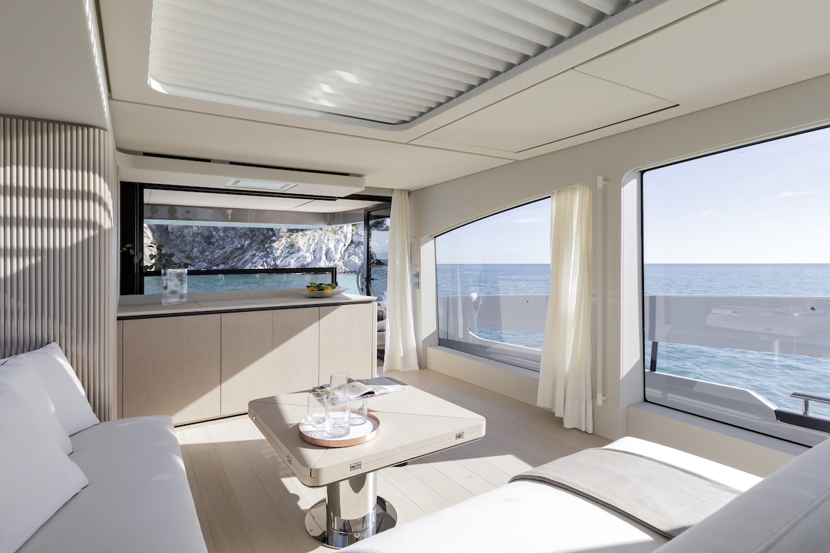 El salón es un espacio diáfano y particularmente luminoso. Luz por los cinco lados: por el enorme parabrisas, por las ventanas de ambas bandas, por popa y por el techo; aunque en este caso se han instalado parasoles fijos. En el exterior notamos descalzos el tacto de la superficie de corcho, en el interior, la sensación es distinta, pero igualmente agradable. Se trata de moquetas realizadas en materiales reciclados de redes de pesca. El diseño interior, ideado por Mateo Tuhn y Antonio Rodríguez, luce un minimalismo que solo rompen los cojines en los sofás, pero el resto intenta pasar desapercibido, como queriendo no estorbar en la visión del paisaje. Un claro ejemplo es la cocina, donde prácticamente todo ha desaparecido, incluso la placa de inducción desaparece bajo la superficie de la encimera.