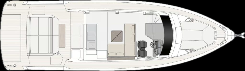 Podríamos destacar que el ancho de los pasillos laterales es correcto para llegar a proa en una navegación tranquila y disfrutar allí del solárium o del asiento que mira a proa. Si bien es algo que se ha de evitar o hacerse con cuidado, caminar descalzo sobre una cubierta de corcho es agradable. No quema, no resbala, está hecha de reciclado de corcho y también se puede reciclar. Es un material cuyas cualidades se ajustan con la función, además de tener profundas raíces mediterráneas y es muy importante a bordo ya que cubre la superficie de toda la cubierta y el suelo de la bañera cuando se hace la magia. La magia de apretar botones para que pistones eléctricos abran las bordas, baje la plataforma de baño y el área de la bañera se convierta en un balneario exclusivo.