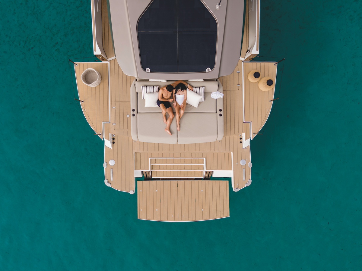 El sistema eléctrico está diseñado para suministrar todas las necesidades de confort nocturnas o en una cala, sin encender motores o generadores, sin ruidos, sin olores. Aquí es donde comienza a lucir el exterior, el solárium, la plataforma de baño, las alas laterales abatibles, todo un despliegue que nos aproxima de forma integral al mar.