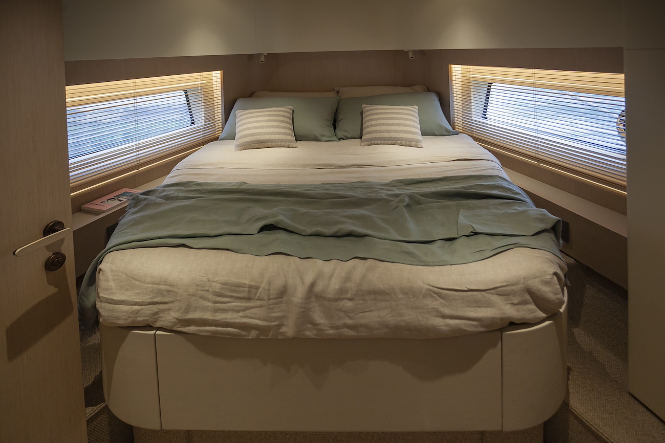La cabina principal ocupa de banda a banda. Se sitúa aproximadamente en el centro de la eslora y evidentemente mantiene el estilo minimalista del resto de las estancias, al igual que los materiales reciclados y/o reciclables utilizados en todo el barco. La cabina de proa es para invitados y hay una tercera cabina con dos camas. Los portillos del casco son la principal fuente de luz natural de cada cabina que se funde en los cálidos tonos claros de tapizados y maderas.