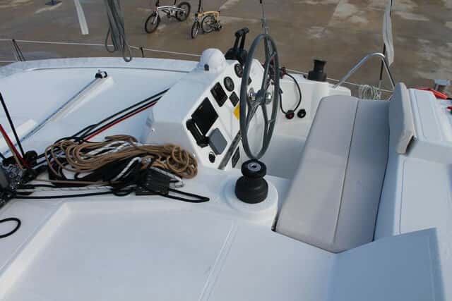 Este puesto de gobierno, con un amplio asiento acolchado con capacidad para dos personas, centraliza toda la maniobra de drizas y escotas desde dos winches y los correspondientes pianos de mordazas a ambos lados, bien al alcance de la mano, lo que permite que una sola persona gobierne el barco con suma facilidad. Frente a la rueda se sitúa la consola que alberga todos los instrumentos de navegación y las palancas de los motores a estribor. Desde aquí la visión sobre la proa es total, toda vez que la botavara, situada muy alta, permite opcionalmente proteger el puesto de gobierno totalmente con una toldilla en caso de que se desee. A su popa, y sobre el tejadillo de la parte posterior del salón y de la bañera, otra área totalmente plana permite instalar grandes colchonetas de solárium, sin que la escota de mayor sea un obstáculo, ya que se encuentra totalmente a popa, lo que deja una extensa superficie libre. En definitiva, un puesto de gobierno ergonómico, cómodo, que permite el control absoluto de la navegación por una sola persona y que además habilita a su alrededor sendas zonas de relax.