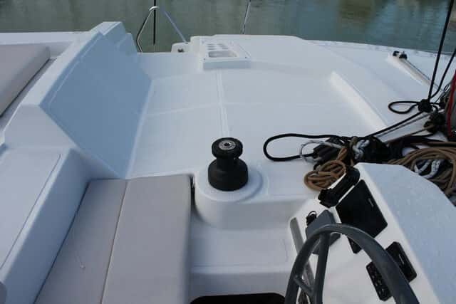 Al adoptar el concepto de salón-bañera en un único ambiente, el espacio y el mobiliario típico de otros catamaranes (banquetas, mesa, cofres) el Bali 4.0 lo suple con creces con la plataforma de proa en la que la habitual red se sustituye por una plataforma rígida estructural entre ambos cascos que se extiende desde el frente de la caseta hasta el travesaño de proa, y que al quedar a un nivel más bajo respecto los pasos laterales configura una excepcional zona de estar al aire libre.