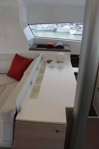La mesa de cartas en L se sitúa a estribor a un nivel ligeramente más elevado y ofrece una consola con capacidad para albergar toda la electrónica de navegación que se requiera, de forma que se convierte en el centro de navegación del barco cuando las condiciones exteriores así lo requieran, disfrutando de absoluta visión sobre el exterior y las velas.