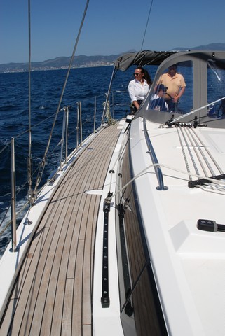 Navegamos en el Bavaria C38 con un viento de 10 nudos, mayor y génova Elvstrom especiales para Bavaria, y la versión de calado estándar profundo de 2 metros.. Con este viento ceñíamos a 5,5 nudos, el barco se asentaba bien sobre el costado y las ruedas se mostraban sensibles aunque no lábiles, lo suficientemente firmes para percibir el más pequeño tirón de la única pala de timón pero sin obligar a estar continuamente trabajando la rueda. La gran mayor, por otra parte, le confiere un punto de ardiente que se agradece. Con el genaquer navegando entre 90º y 120º alcanzamos los ocho nudos con un viento real de 12,5 nudos, unas prestaciones satisfactorias para este barco que, aunque ligero por su construcción en sándwich laminado a mano, desplaza más de nueve toneladas en rosca.