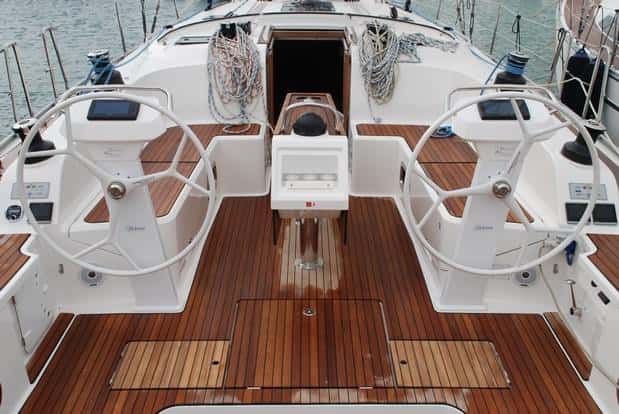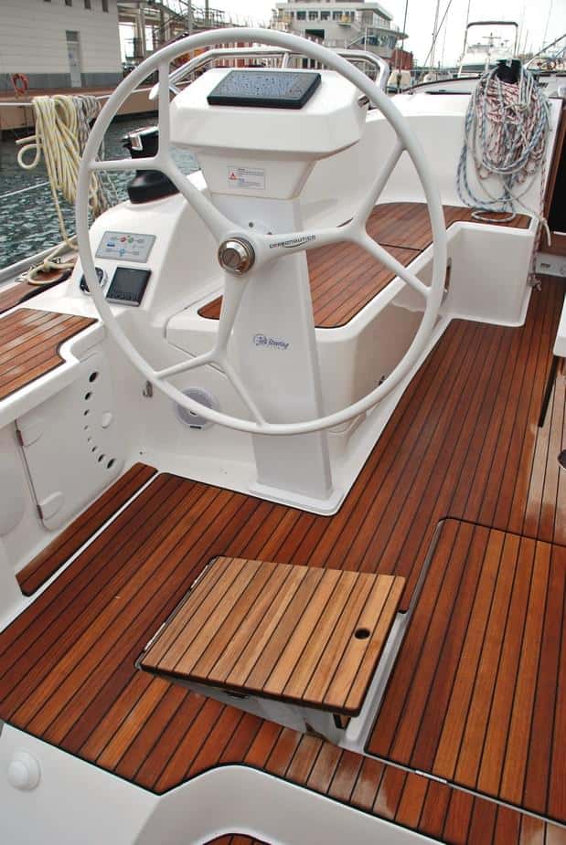 En cubierta todas las escotillas son enrasadas y disponen de cortinillas de sombra y mosquitera. De serie se entrega con teca en las banquetas de la bañera y en la plataforma de baño.