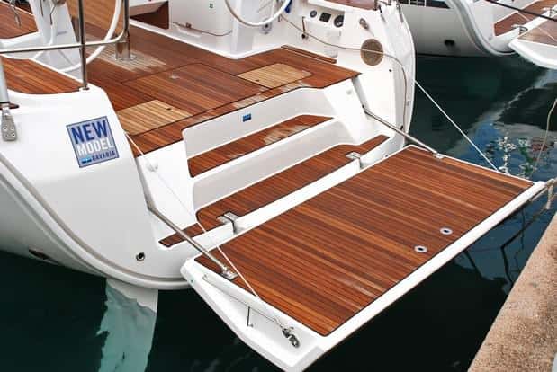 A destacar también la gran plataforma de popa que se forma al abatir el espejo, que cuenta con pistones y cable de seguridad, y que permitirá disfrutar en los fondeos de una sólida y espaciosa superficie de baño, con agarres y escala.