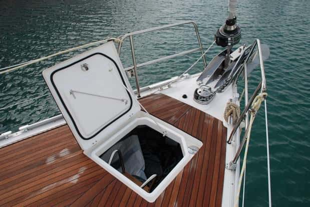 Una escotilla enrasada da acceso al pañol de velas del triángulo de proa.