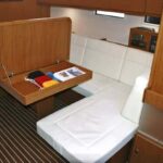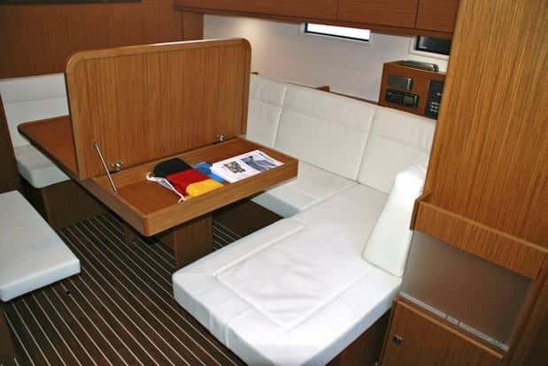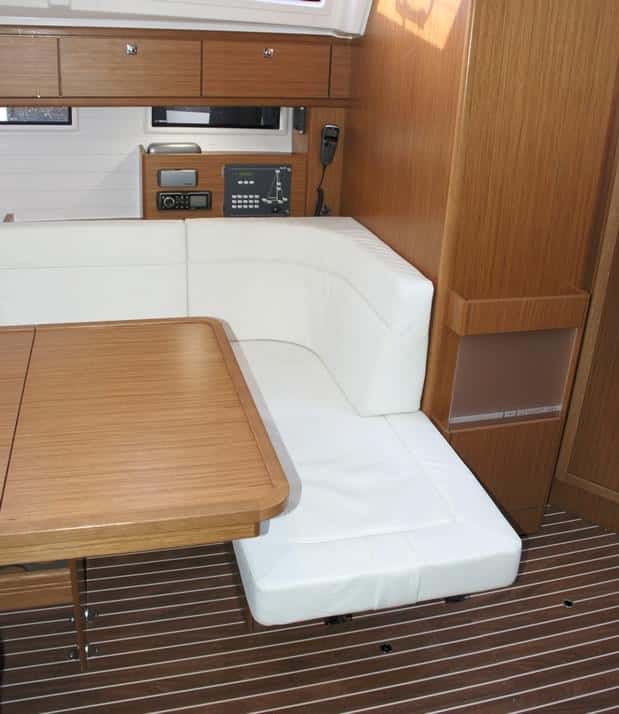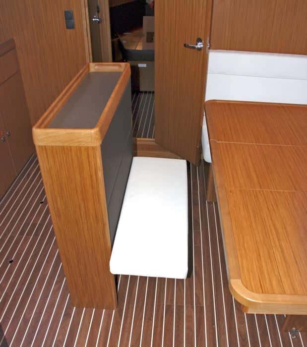 En consecuencia, y como beneficio añadido al ahorro en precio e instalaciones, el salón se hace más grande y permite disponer de un sofá de popa extensible que permite que una persona más se siente en la mesa, y que es a la vez utilizable como tumbona. Al lado, en el mamparo del baño, un revistero con repisa permite guardar tanto libros como cartas de navegación.