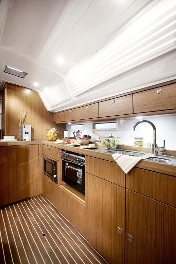 La cocina se ha situado longitudinalmente a babor y pese a ser grande y disponer de numerosas superficies de trabajo y de estiba, adolecía en la unidad de probada de algunos defectos que se corregirán. Entre ellos la colocación de una ventana más integrada en la cocina, la sustitución de los guardamares actuales por otros de mayor altura y la colocación de otra nevera. También aquí el diseño piensa en el crucerista, ya que la cocina se dota de una superficie extra a popa destina a electrodomésticos como la cafetera exprés, otro elemento cada día más frecuente a bordo.