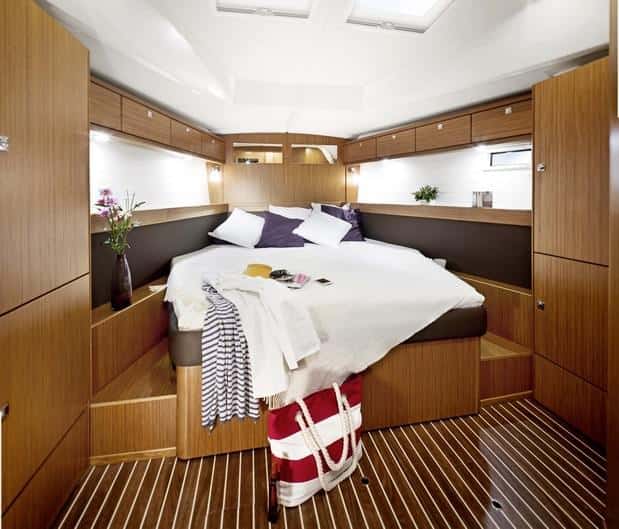 La cabina de proa de la versión tres cabinas, con una gran cama central, dispone de armarios altos a lo largo de las bandas, así como de estanterías a la altura de la cama. El triángulo de proa se destina a cofre de velas, con acceso desde cubierta.