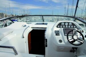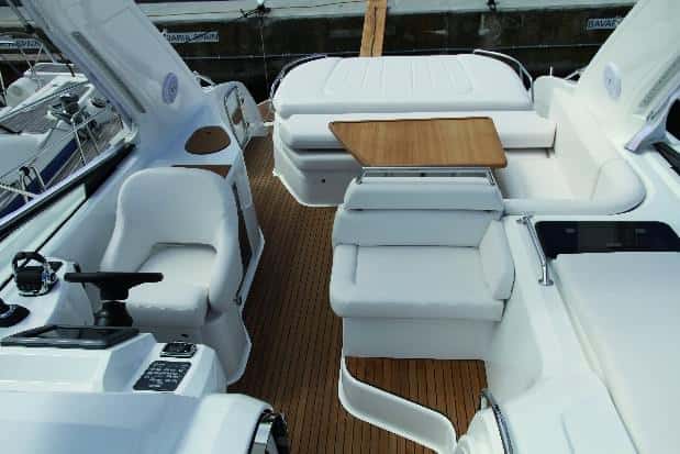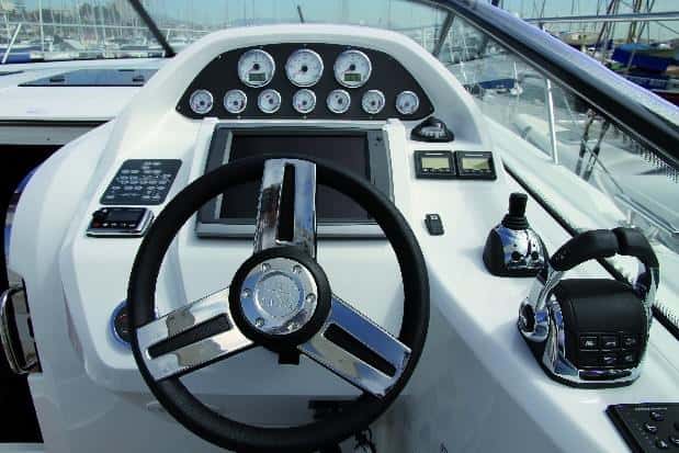 El cuadro de interruptores, con pulsadores estancos y el equipo de música se han colocado a babor, y debajo la radio. Sin embargo, en este lado se echa en falta un asidero para el acompañante, que puede ir de pie frente a la puerta de la cabina. La opción de un puesto monoplaza ha permitido ganar espacio para la entrada a la cabina y el diván de babor. Por último, recordar que el joystick de Volvo Penta DPH permite una maniobrabilidad total para amarrar, ya que puede desplazar el barco lateralmente y en cualquier otro sentido.Un puesto más que correcto, bien protegido y cómodo, con perfecta visibilidad. Adecuado a este barco.