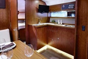 Bavaria sabe hacer barcos para vivir, navegar y confortables, sin lujos y nada recargados. La prueba está en la decoración de los interiores, que combina la carpintería, más que correcta, con unos acabados de calidad, luminosos y bien aireados.